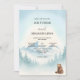 This winter wedding invitation showcases a peaceful watercolor mountain landscape with snow-capped peaks, misty pine trees, and a small brown bear adding a charming storybook feel. The soft blend of light blue, white, and muted grey tones creates an airy, romantic winter mood. The design includes editable text, making it easy to customize your names, date, and wedding details for a natural and elegant look.