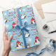 Three adorable little black and white penguins are having winter fun on this cute Christmas wrapping paper. One penguin is making snowballs. Another one is carrying a green and red striped heart shaped candy cane. Another one is sliding on a patch of ice. All of the penguins wear brightly coloured winter stocking caps. A few red or white snowflakes drift down around them. Your custom text is in red, and everything is placed on an icy blue background.