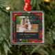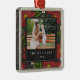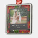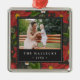 Elegant personalized Christmas ornament features your favorite horizontal or landscape oriented photo set on a background of vibrant red poinsettia flowers, green botanical foliage and tiny white blossoms. Personalize with two lines of custom text for a unique addition to your holiday decor; shown with family name and the year.