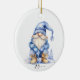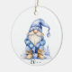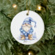 Capture the magic of the season with this charming round ceramic Christmas ornament, perfect for commemorating meaningful holiday moments. The front features a whimsical illustration of a cozy winter gnome dressed in a soft blue coat, matching boots, and a fluffy white beard, sitting peacefully on a rustic log surrounded by snow. The scene is rendered in a gentle watercolor style, evoking the quiet charm of a snowy woodland.