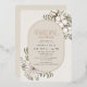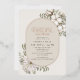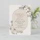 Bridal Shower invitation featuring a watercolor evergreen greenery with white flowers around an oval frame with a rose gold touch