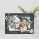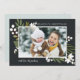 Elegant botanical holiday photo cards put your favourite horizontal or landscape oriented photo front and centre, accented by green botanical sprigs, foliage, leaves and white lily of the valley flowers, on a contrasting rich black background. Add your custom Christmas greeting (shown with "Season's Greetings"), and your family signature. An elegant and festive holiday photo card that's sure to please everyone on your Christmas card list this season!