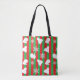 Cute holiday bag with white snowflakes, red and green stripes,, white mittens and winter hats.
