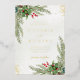 Beautiful Save the date card featuring hand-painted botanical watercolor illustrations of winter greenery, pine and spruce branches, cones and holly berries with gold glitter. Perfect choice for winter or Christmas holiday themed weddings.