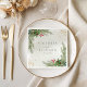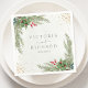 Beautiful wedding napkin featuring hand-painted botanical watercolor illustrations of winter greenery, pine and spruce branches, cones and holly berries with faux gold glitter. Perfect choice for winter or Christmas holiday themed weddings.