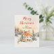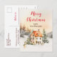 This beautiful and festive watercolor Christmas postcard can be personalized with your family name. It features a rustic winter cottage surrounded by snow and trees. There are adorable animals, such as a husky dog and a rabbit, and also a snowman and foliage. The text combines handwritten script and sans serif fonts for a stylish and modern look.