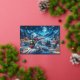 A lovely watercolor image of a nighttime winter scene with a vintage steam locomotive arriving at a station adorned with festive Christmas lights. Snow blankets the ground and rooftops, and the backdrop features towering mountains under a starry sky with a full moon. The warm glow of the train’s headlamp and the twinkling lights create an inviting and cozy holiday atmosphere, evoking feelings of nostalgia and celebration associated with the Christmas season.