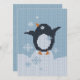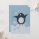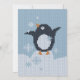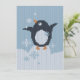 Knitted little cute penguin rejoices falling snowflakes