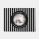 Watercolor painting of a winter scene in New England, a quiet day when the snow has just fell into the ground. Quite picturesque and peaceful. The design has black circle frame around it with personalized texts on the top and lower side. The design has vertical grey and black stripes pattern. Customizable in Zazzle with your own text for a personalized design. Check out my store for matching items!