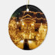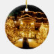 A festive image of a wintry inn aglow with holiday lights graces this cheerful holiday ornament.