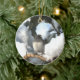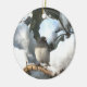 Porcelein ornament with photos of a slate-coloured junco in the winter snow.