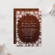 Lacy white, winter snowflakes decorate the border of this dark brown wedding invitation, that has an illustrated barn board background making it perfect for the rustic or county winter wedding.