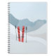 Abstract winter landscape with panoramic mountain view, red ski equipment, trail and blue sky