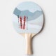 Abstract winter landscape with panoramic mountain view, red ski equipment, trail and blue sky