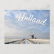 Photo postcard of a minimalistic view on a winter landscape in Holland with a path and a canal towards a windmill under a layer of snow with nice clouds at sunrise in the dutch countryside with the text 'Holland'.