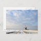 Photo postcard of a minimalistic view on a winter landscape in Holland with a path and a canal toward a windmill under a layer of snow with nice clouds at sunrise in the dutch countryside with a fading white bar and the text 'Holland'.