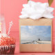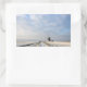 Rectangular photo sticker with a minimalistic view on a winter landscape in Holland with a path and a canal towards a windmill under a layer of snow with nice clouds at sunrise in the dutch countryside.