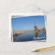 Postcard of a landscape in the countryside in the Netherlands in winter with a windmill, ice on the river and frosted reeds under a clear blue sky with a white edge and in white the text 'Holland'. The image is a bit rotated to create the illusion of it laying loose.