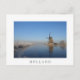 Postcard of a landscape in the countryside in the Netherlands in winter with a windmill, ice on the river and frosted reeds under a clear blue sky with a white border and the text 'Holland'.