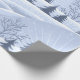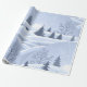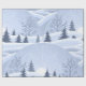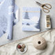 This winter landscape shows a frozen lake surrounded by snow-covered hills and trees. The design has a circular pattern with a sunburst in the sky. The colour scheme is blue and white.