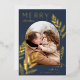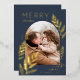 A chic and elegant holiday card design featuring a single vertical or portrait-oriented photo in a unique arched layout, embellished with finely detailed botanical foliage in gold foil. "Merry Christmas" appears at the top left, with your family name at the lower right. A refined nature-inspired choice for your Christmas 2022 greetings.