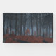 A stand of trees on an overcast winter day. The tall trees are bare and leafless, but the saplings underneath still have their brown leaves. The still-clinging and fallen leaves in shades of almost-pink provide a contrast to the dark trunks and foggy blue haze above.