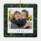 A sweet double sided photo ornament displaying a favourite photo on each side, on a hunter green watercolor background dotted with string lights. Personalize with a custom caption on the front in handwritten lettering, and add the year to the back.