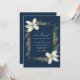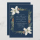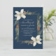 Winter pine cones and white flowers on a navy blue with elegant script wedding invitation.