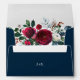 Classy personalized dark navy blue wedding envelope with red burgundy botanical peony flowers and pine green fir branches, red berries and foliage bouquet inside and with editable monogram name initials / your address on the back.