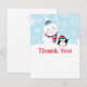 Winter wonderland "ONEderland" first birthday party thank you note card includes space on the bottom and back for a handwritten thank you message. Design features a happy snowman wearing a hat and scarf and a cute arctic penguin with Santa hat and number "1" on his tummy that is waving in the snow. The background has a pattern of snowflakes. Ice blue, turquoise, red, and white colours with black and grey accents.