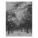 A black and white photograph of a snow-covered path winding through bare trees as snowfall blurs the distance. Soft light and deep shadows create a reflective, quiet winter mood.