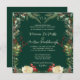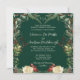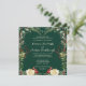 Dark pine green with framework of watercolor florals. Florals feature cream white roses, red winter berries, and evergreen foliage.