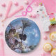 An ethereal magical image with an up close view of a pine tree and its branches with many pine cones grouped together. The night sky is a combination of enchanting blues and purples swirling together with ethereal luminous formations and bright twinkling stars shining up above.