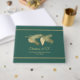 Elegant emerald green and gold tone holiday guest book, with graphics of golden pine cones and pine branch. Personalize the text fields for your holiday open house or Christmas party.