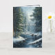 Beautiful Christmas card with an image of snow covered rocks, tall pine trees, snowflakes and a lovely flowing river.