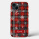 Winter red and black plaid with snow and snowflakes cell phone case personalized with a name in an editable chic handwritten script font style. ASSISTANCE: For help with design modification or personalization, colour change, resizing, transferring the design to another product or if you would like coordinating items, contact the designer BEFORE ORDERING via the Zazzle Chat MESSAGE tab below or email makeitaboutyoustore@gmail.com.