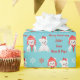 Two adorable baby polar bears sit side by side in a pattern on this cute kids' Christmas wrapping paper. The boy bear wears a red winter hat and holds a gift package. The girl bear wears a red bow and holds a candy cane. A few red and white snowflakes drift down around them. Your custom text is in red between the paired images, and everything is placed on a teal background.