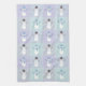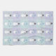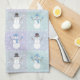 Four squares in pale blues and purples are decorated with snowmen wearing top hats and winter clothing, like toboggans, scarves, and mittens. White stitching adds a decorative touch, giving the repeating pattern the appearance of a quilt, creating a perfectly cozy feeling for winter.