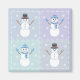 Four squares in pale blues and purples are decorated with snowmen wearing top hats and winter clothing, like toboggans, scarves, and mittens. White stitching adds a decorative touch, giving the repeating pattern the appearance of a quilt, creating a perfectly cozy feeling for winter.