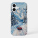 An energetic impressionistic painting captures a thrilling winter race through a snow-covered mountain landscape. A bright red vintage race car speeds along a winding road, kicking up snow, while towering evergreen trees and rugged peaks frame the background. The sky is painted with broad, expressive strokes of icy blue and white, giving a sense of movement and cold atmosphere. The texture of the paint is thick and gestural, emphasizing the rush and energy of the scene. The combination of bold, impressionistic brushwork and the contrast between the warm red of the car and the cool blue snow creates a striking composition full of excitement and motion.