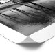 A black and white photograph of trees on a snowy bank reflected in the large pond below creating a winter pattern.