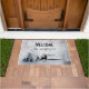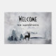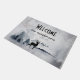 Welcome doormat with a watercolor image featuring a black silhouette reindeer standing among some pine trees. Grey black and white neutral colour scheme.