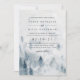Élégante invitation de mariage hivernal, un arrière - plan d'aquarelle représentant un paysage de montagne enneigé parsemé de pins dans les nuances brumeuses de bleu et de gris. Personnalisez avec vos détails de mariage en lettrage doux et noir. Un beau choix pour des mariages d'hiver élégants en montagne ou en forêt.
