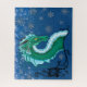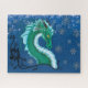 Blue, green and teal dragon profile portrait with snow falling all around. Black tribal rose.