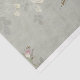 Vintage wallpaper design. We see delicate bouquets of pastel pink and white roses with sprigs of some coniferous tree. Behind each bouquet there are decorative tree branches with frozen whitish leaves. The general background of the design is silver-grey with scattered small roses. This decoupage tissue paper will be perfect for your craft projects