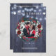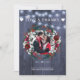 Rustic winter wedding thank you photo card with white and red burgundy trendy watercolor peony roses flowers and blooms with seasonal pine hunter green fir branches and holly berries over a dark navy blue barn wood like background with string lights.++++++++ Personalize it with 2 photos (one square on the front side and one landscape on the reverse), with your signature and text on front and back! +++++++++++++ Suitable for winter Christmas themed rustic country farmhouse weddings.