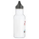 A water bottle with a digital image of a painted illustration of a red church and steeple. A bright Christmas star shining overhead. Families out in front arriving for a church service. Winter snow covers the ground and rests on cute bushy pine trees. Merry Chirstmas written in a red trendy font.