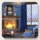A cozy reading corner on a snowy winter day, with a ginger cat sitting gazing at the blazing fire. Around the hearth are cushy armchairs, with glowing candles and stacks of books and a steaming mug to complete the comfort. Outside a frost-covered willow and beech hedge are obscured by the falling snow.