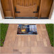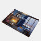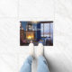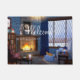 A cozy reading corner on a snowy winter day, with a ginger cat sitting gazing at the blazing fire. Around the hearth are cushy armchairs, with glowing candles and stacks of books and a steaming mug to complete the comfort. Outside a frost-covered willow and beech hedge are obscured by the falling snow.