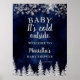Welcome your little one in style with our 'Baby, It's Cold Outside' welcome sign. This design showcases a shimmering FAUX silver glitter that sparkles like falling snowflakes against a contemporary navy blue watercolor background. The elegant silver pine tree forest detail adds a touch of sophistication to this charming baby shower sign, creating a perfect blend of modern style and winter whimsy.